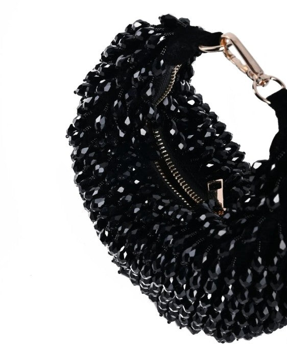 Touhfey's Black Embellished Crystal Moon Bag by Gokraftly combines Western and Indian styles with intricate crystal detailing.